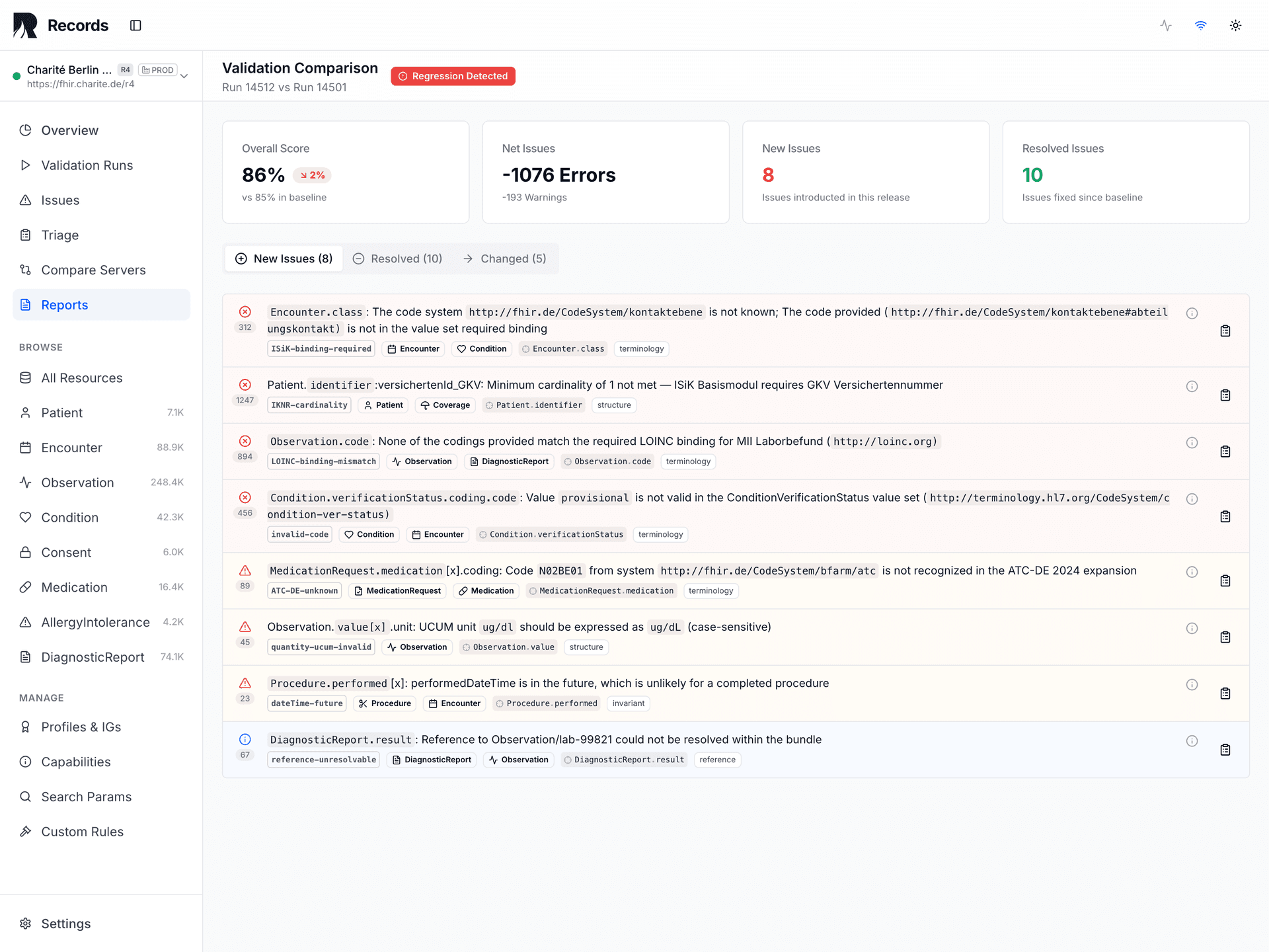 Compares each validation run against baselines. Surfaces regressions from server upgrades, profile revisions, terminology changes, and pipeline modifications.